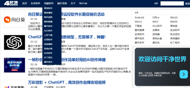 423Down是运营了很久的windows系统软件资源分享网站,包含的软件有安卓软件,电脑软件,原创软件,媒体播放,网页浏览,图形图像,聊天软件,办公软件,上传下载,实用软件,系统辅助,系统必备,安全软件,补丁相关,硬件相关,操作系统等。注意辨别其中有一些广告软件不要下载。